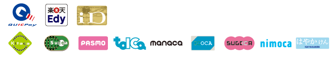 カウボーイ家族では下記の電子マネーがご利用いただけます。 QUICPay(クイックペイ)、楽天Edy、iD 交通系電子マネー(Kitaca、Suica、PASMO、TOICA、manaca、ICOCA、SUGOCA、nimoca、はやかけん) ※カウボーイファミリー沖縄ライカム店では、楽天Edyをご利用いただけません。 ※PiTaPaはご利用いただけません。 ◎上記名称等は、各社の商標、登録商標です。